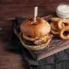 140 gr. özel tavuk, karamelize soğan, cheddar peyniri, salata ve parmak patates ile.